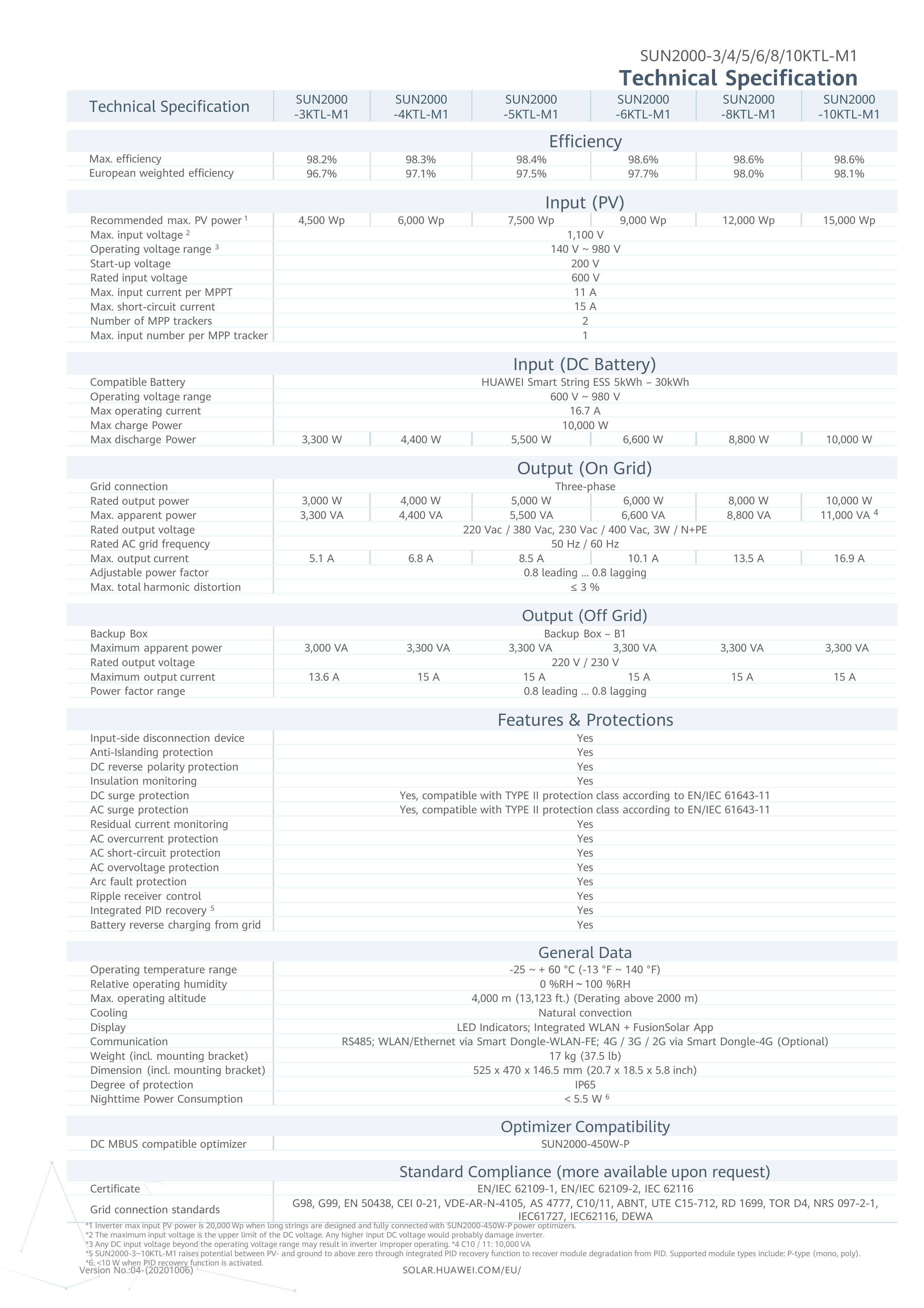 With built-in WLAN and Ethernet communication, optional 4G connectivity, and full compatibility with the FusionSolar monitoring platform, the SUN2000-4KTL-M1 allows real-time performance tracking, remote diagnostics, and easy commissioning. Its compact, lightweight design and IP65 protection rating make it suitable for both indoor and outdoor installations.
