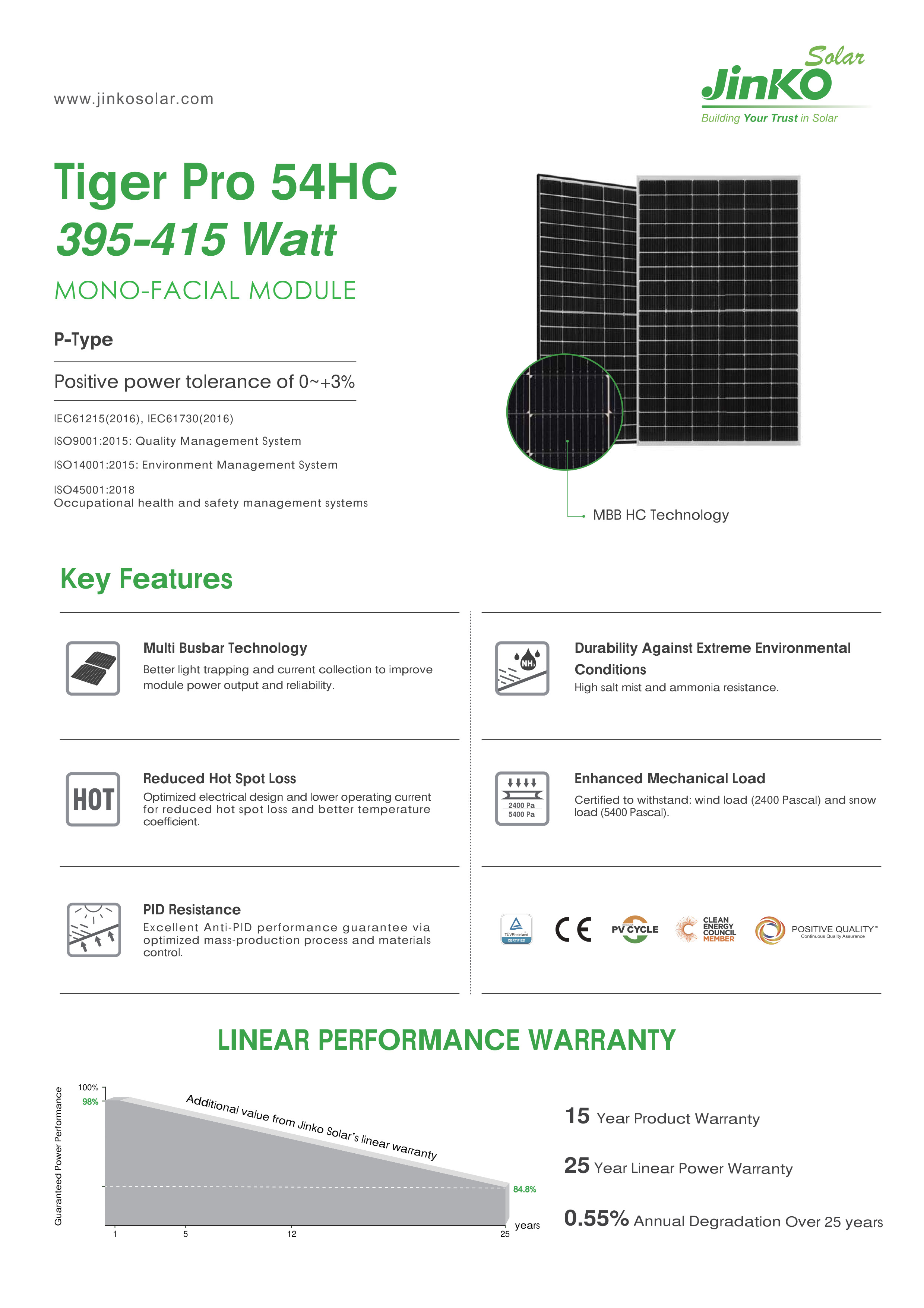 With reduced hot spot risk, superior PID resistance, and strong mechanical load capability (5400 Pa snow load / 2400 Pa wind load), the Tiger Pro 54HC series ensures long-term reliability in harsh environments. Backed by a 15-year product warranty and 25-year linear output warranty, it provides excellent long-term value and dependable power production.