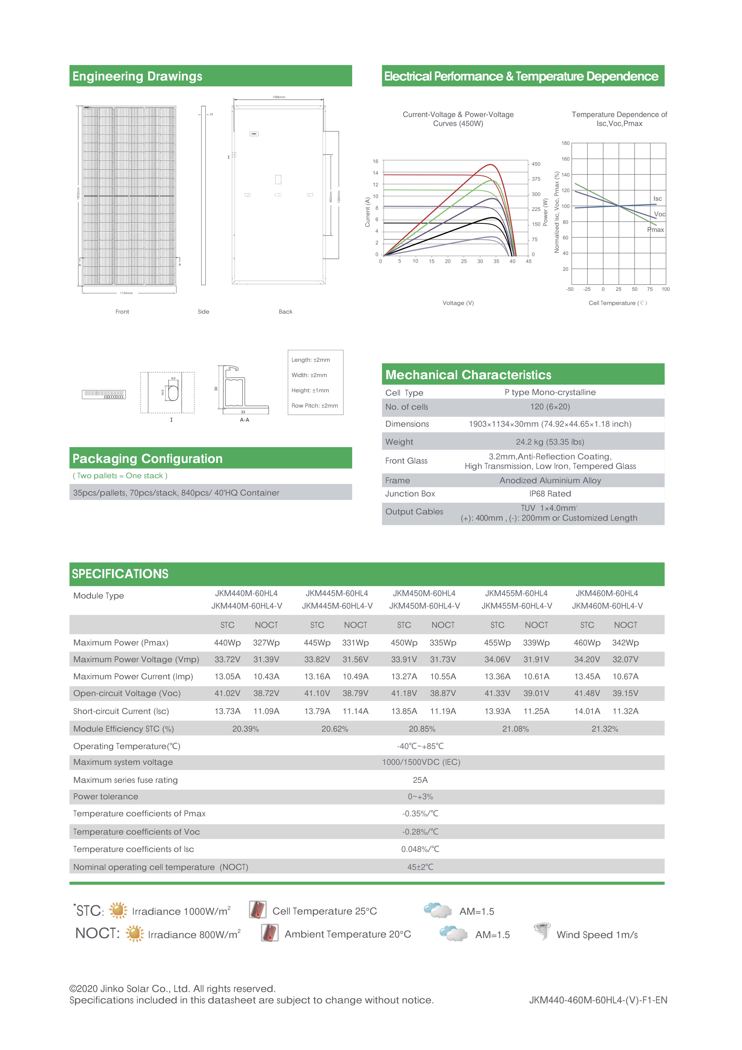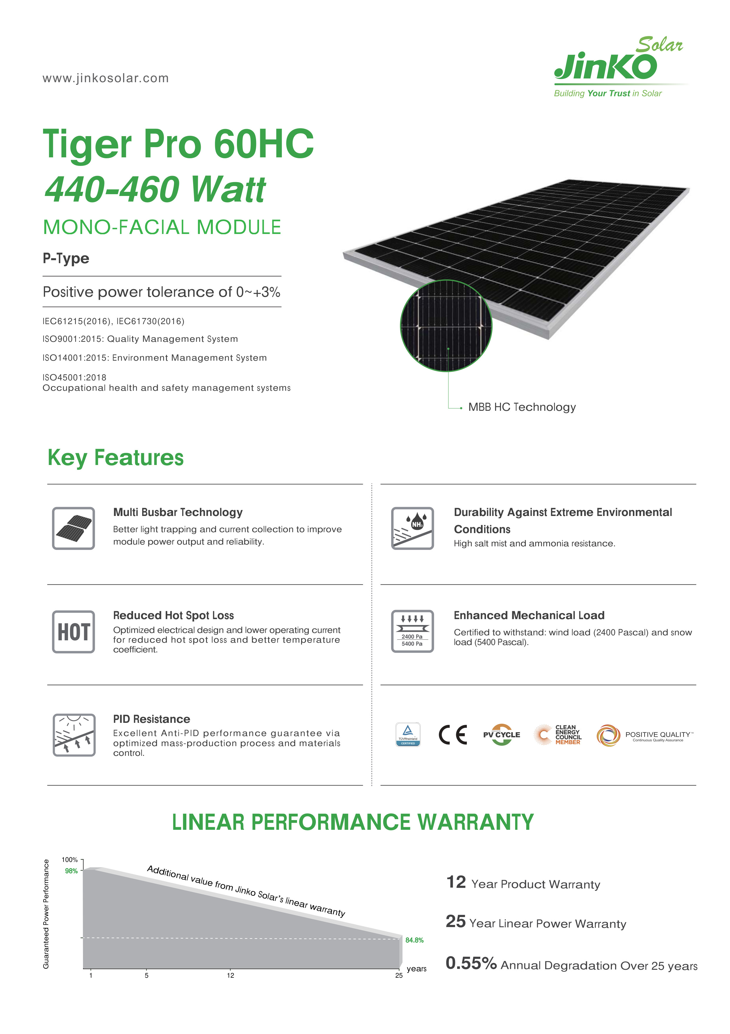 The Jinko Solar Tiger Pro 60HC 460W is a high-performance monofacial solar module designed for residential and commercial installations. Built with multi-busbar half-cell technology, it offers improved light capture, reduced electrical resistance, and enhanced energy yield.