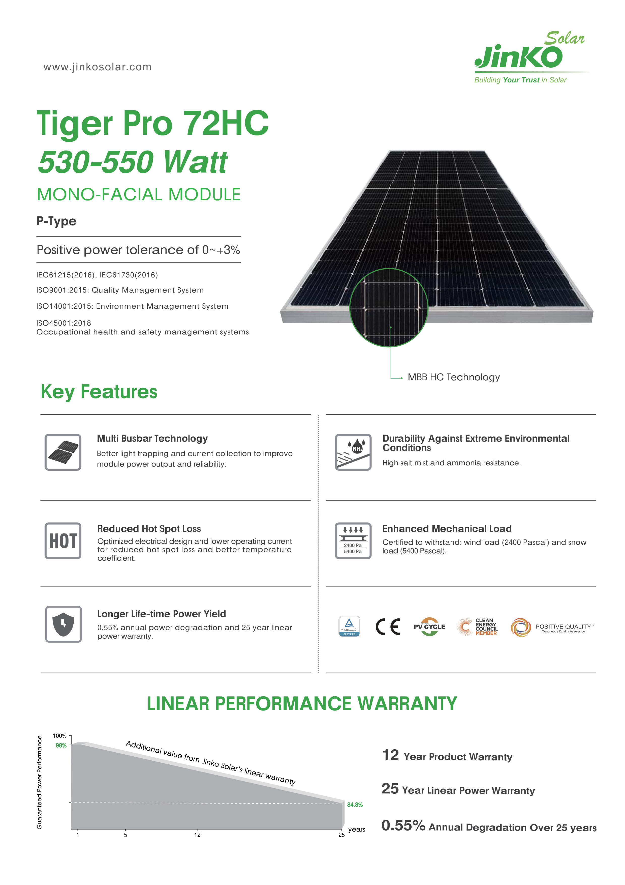 The Jinko Solar Tiger Pro 72HC 550W is a high-power module engineered for large commercial, industrial, and utility-scale installations. Using advanced Multi-Busbar (MBB) technology and a 144-cell half-cut layout, this panel delivers excellent efficiency, improved reliability, and strong energy yield even under low-light conditions.