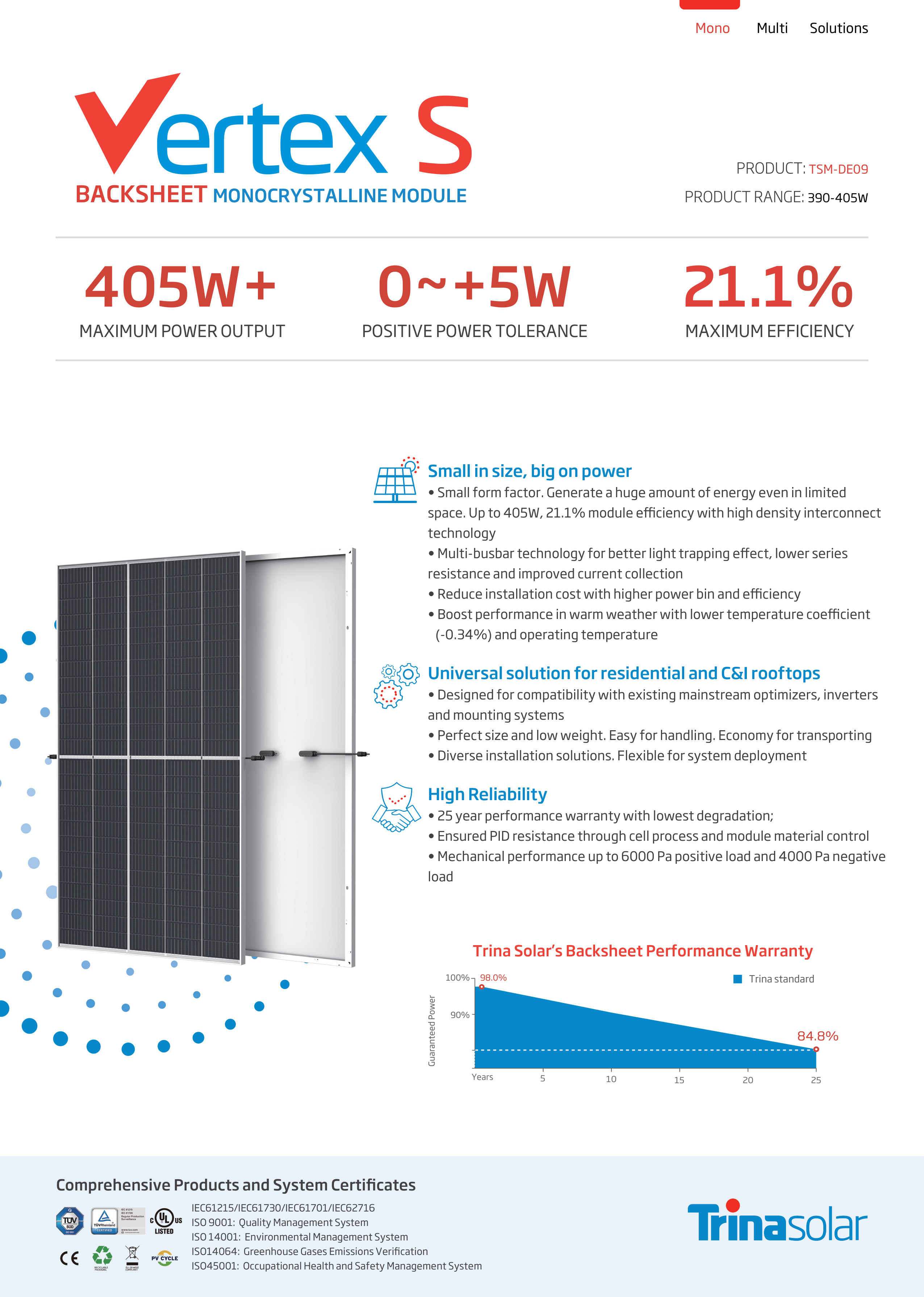 Trina Solar Vertex S TSM-DE09 – 405W Monofacial Solar Panel