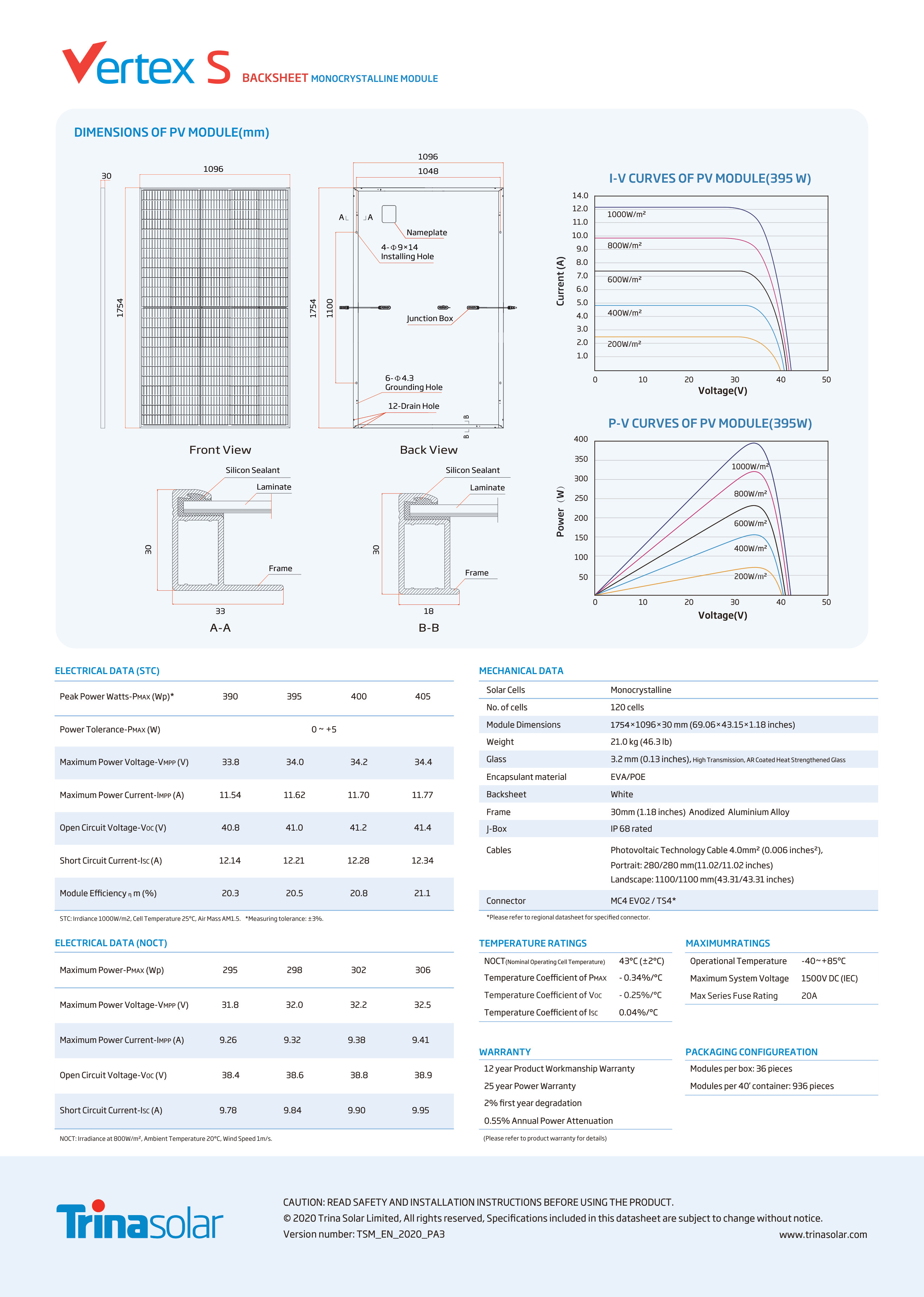 Backed by a 12-year product warranty and a 25-year linear power warranty, the Trina Vertex S 405W ensures consistent long-term energy production and dependable quality.