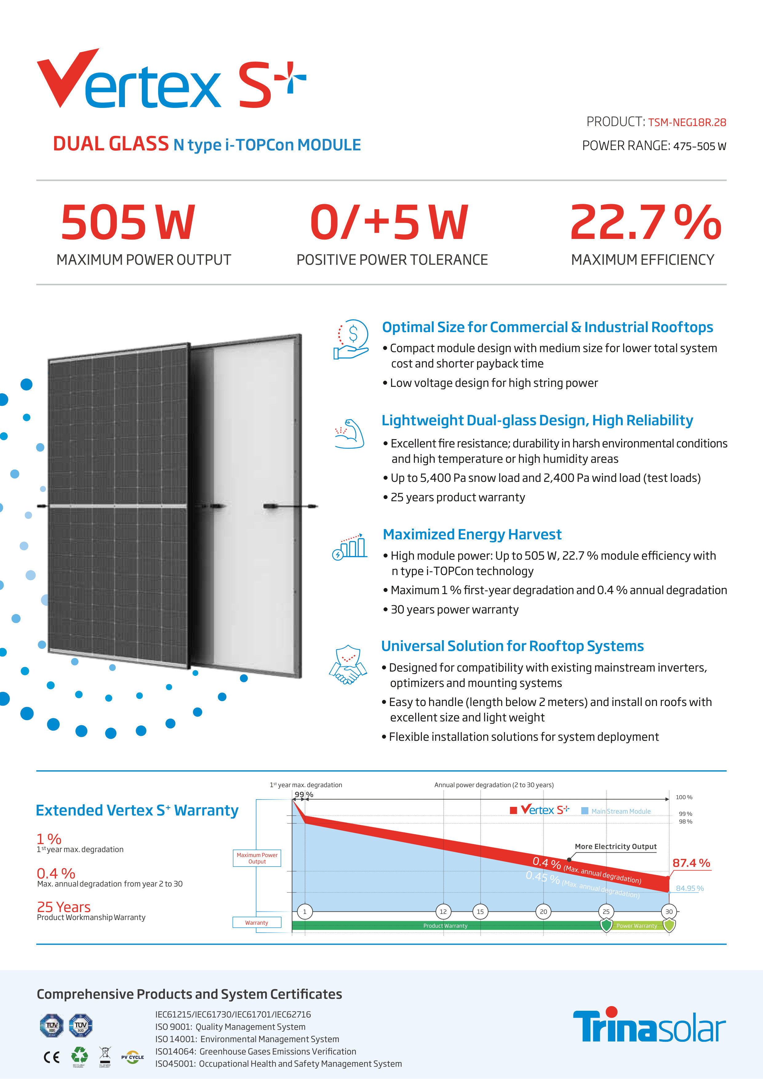 The Trina Solar Vertex S+ TSM-NEG18R.28 – 505W is a high-performance dual-glass N-Type TOPCon module designed for commercial and industrial rooftop systems. Thanks to its 22.7% efficiency and advanced cell technology, it delivers strong energy yield and superior long-term reliability.